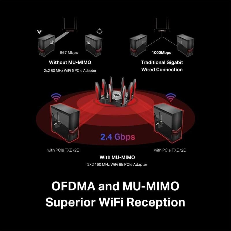 - Velocidad tribanda inigualable : aumente sus velocidades generales hasta 2402 Mbps (6 GHz) + 2402 Mbps (5 GHz) + 574 Mbps ( 2,4 GHz)