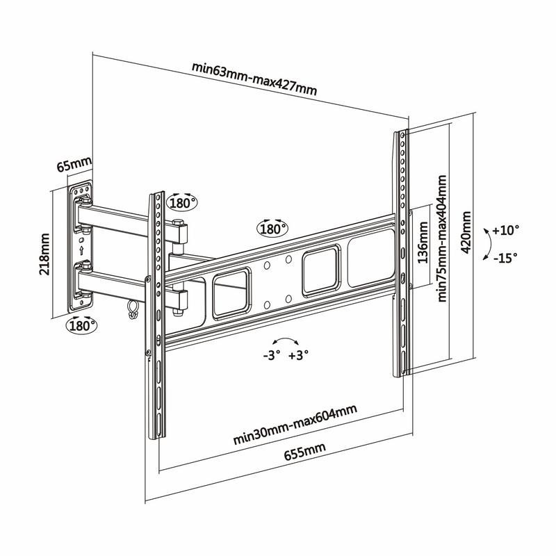 - Ángulo de nivelación: -3º / 3º. Distancia de la pared: ajustable entre 63 y 427 mm (depende de la instalación y del espacio disponible). Manual de instrucciones varios idiomas.