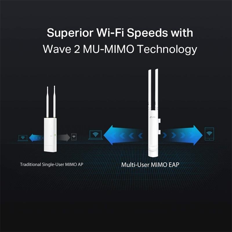 EAP225-Outdoor de doble banda soporta velocidades hasta 1200Mbps. Equipado con la tecnología MU-MIMO 802.11ac Wave 2, EAP225-Outdoor puede comunicarse con múltiples clientes al mismo tiempo siendo ideal para ambientes de alta densidad.