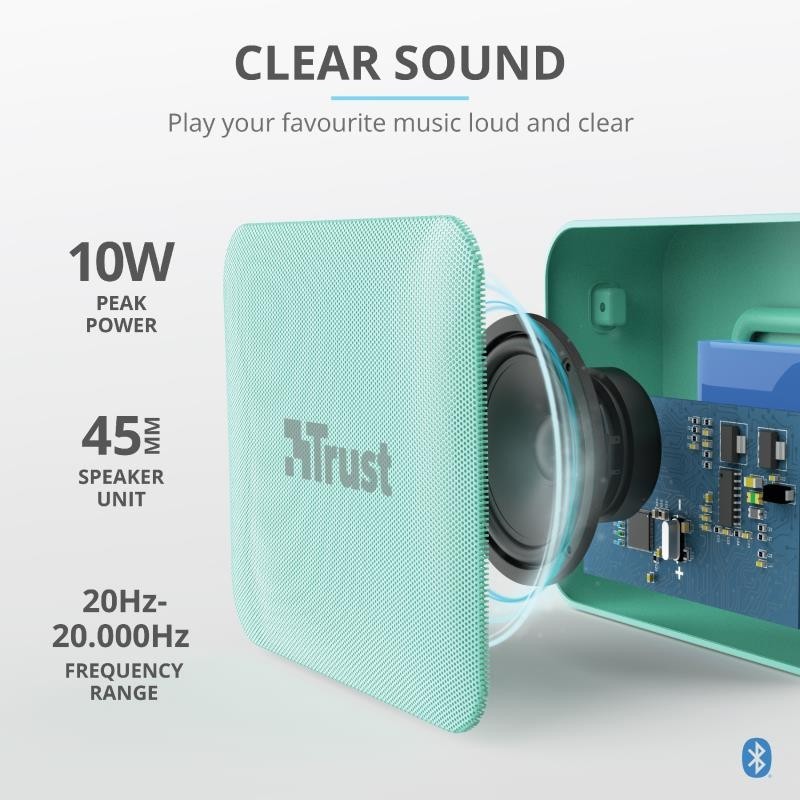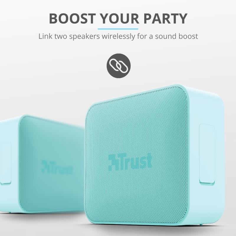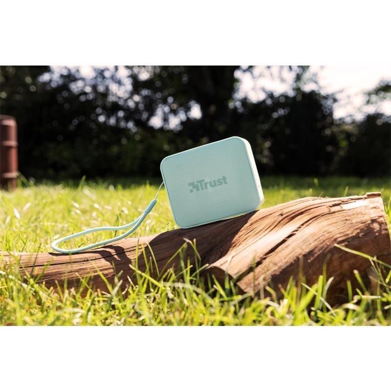Lo mejor del Zowy de Trust es que es muy pequeño. No podrás dejarlo en casa, te lo querrás llevar a todas partes. Por eso es importante que este altavoz esté seguro en todo momento. Por su carcasa impermeable y la rejilla metálica, este altavoz tiene la certificación IPX7. Esto significa que no pasa nada si le cae agua encima, la música seguirá sonando. Con lluvia o con sol, en la piscina o en las pistas de esquí, el Zowy hará que la fiesta no decaiga.