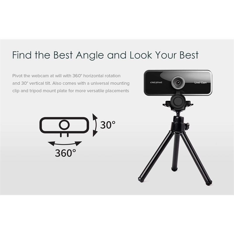 - Vídeo panorámico Full HD y un buen aspecto desde cualquier ángulo: Creative Live. Cam Sync 1080p V2 te presenta vídeos Full HD precisos que son fluidos, nítidos y vibrantes. El amplio campo de visión de 77° te permite capturar más de todo con una mínima distorsión óptica, lo que te permite realizar videollamadas cómodamente como grupo. Además, la cámara se puede girar 360° horizontalmente e inclinar 30° verticalmente y se suministra con una pinza de montaje universal