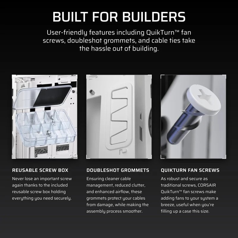- Características amigables para el ensamblador - Una gama de innovaciones de CORSAIR mejora la experiencia de construcción, incluyendo soporte para montaje vertical sin brackets adicionales, tornillos Quikturn de un giro, pasacables flexibles de doble inyección y cortes externos para la gestión de cables.