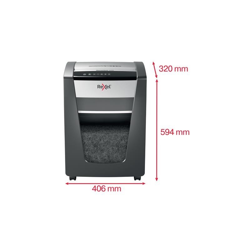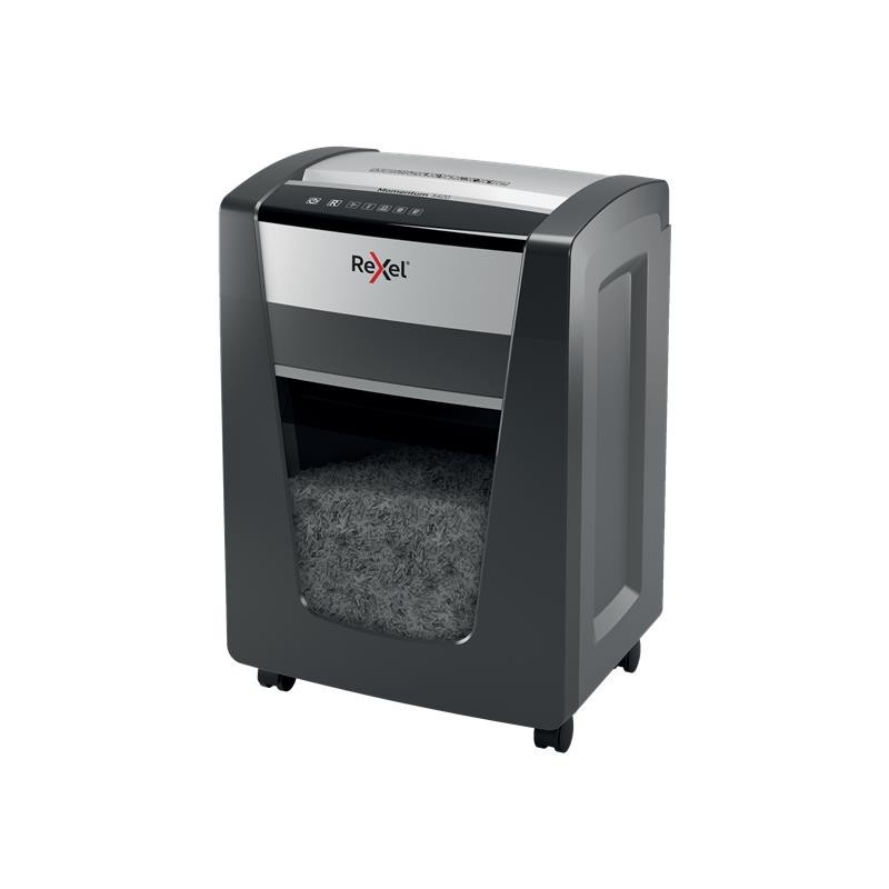¡La potencia para destruir más! La destructora de papel Rexel Momentum X420 destruye hasta 20 hojas de una vez, funciona ininterrumpidamente durante 4 horas y es ideal para oficinas pequeñas. La tecnología antiatasco del modelo X420 garantiza el funcionamiento ininterrumpido. P4, corte cruzado (partículas de 4 × 40 mm). Trituradora silenciosa con botones táctiles sencillos e intuitivos y una generosa papelera de 30 litros de capacidad (275 hojas A4).