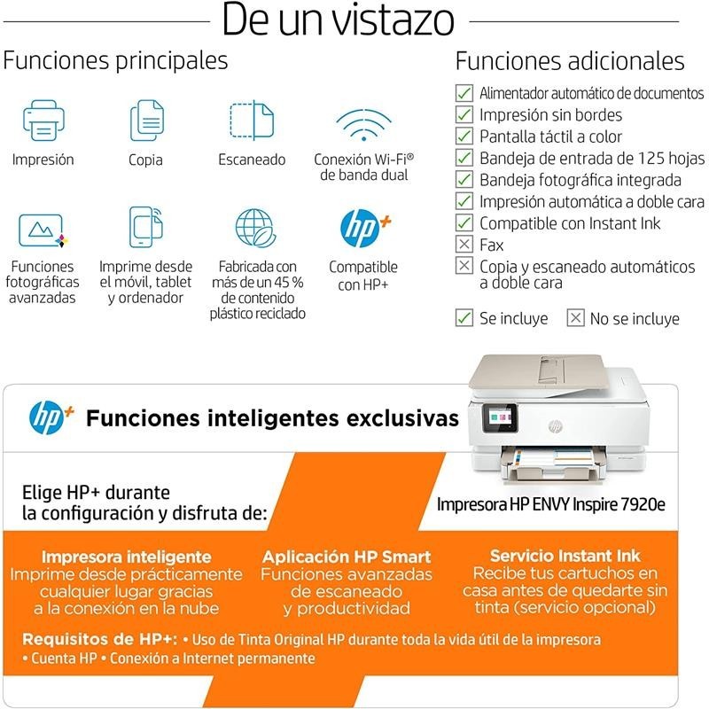 - HP+ requiere una cuenta de HP, una conexión permanente a Internet y el uso exclusivo de Tinta Original HP durante toda la vida útil de la impresora. Más información legal en hp.com/plus