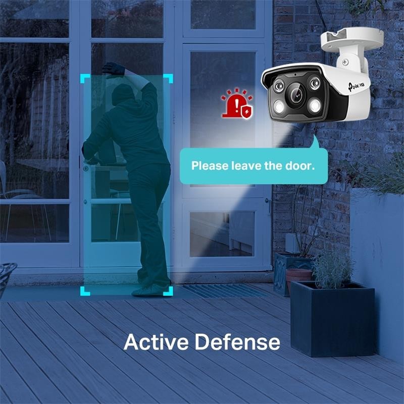 La cámara IP VIGI tipo bullet Full Color de 4MP ofrece imágenes de alta definición y visión nocturna a todo color. Utiliza IA para distinguir humanos y vehículos, enviando notificaciones inteligentes. Incluye alarma de luz y sonido, micrófono integrado, y tecnología H.265+ para optimizar almacenamiento y ancho de banda. Es resistente al agua (IP67), soporta PoE y 12V CC, y permite gestión a través de NVR UI, la aplicación VIGI, y VIGI Security Manager, con almacenamiento en tarjeta microSD de hasta 256 GB.